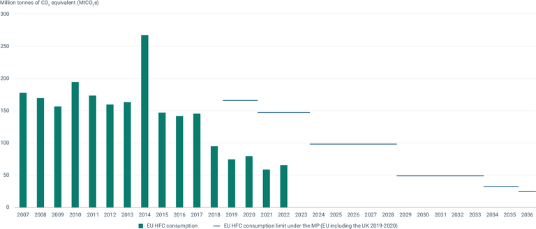 See all EU institutions and bodiesThis graph shows the EU contribution to the global phase-down of HFCs under the Kigali Amendment to the Montreal Protocol, which introduces limits to the consumption of HFCs, starting in 2019. HFC, hydrofluorocarbon; Mt, million tonnes. HFCs covered under the Montreal Protocol do not include HFC-161. A country’s baseline for the Montreal Protocol HFC phase-down is defined as the average HFC consumption during the period 2011-2013, plus 15% of the HCFC baseline in 1989, all expressed in million tonnes (Mt) CO2 equivalent. As set out in the Montreal Protocol, the HCFC baseline also includes 2.8% of 1989 chlorofluorocarbon (CFC) consumption.