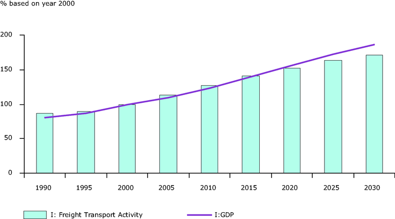 Freight transport activity increase in comparison to GDP growth in EU 27, 1990-2030