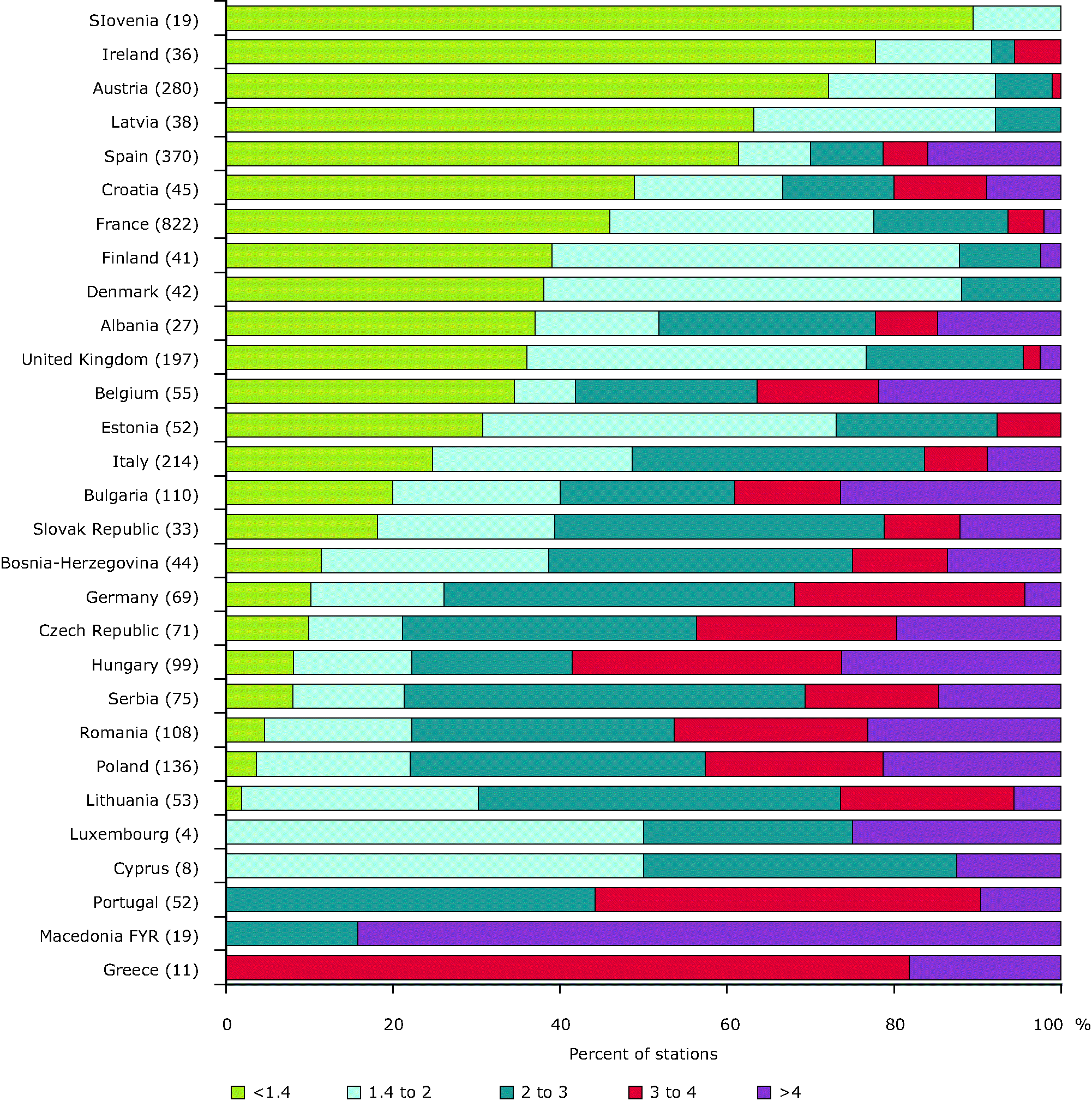 BOD7 data from Estonia (EE), Finland (FI) and Lithuania (LT) have been recalculated into BOD5 data. The number of stations with annual means within each concentration band are calculated for the latest year for which data are available. The latest year is 2006 for all countries except Albania (AL), Bulgaria (BG), Italy (IT) and the United Kingdom (GB) (all 2005), Greece (GR) (2004) and Cyprus (CY) (1999).