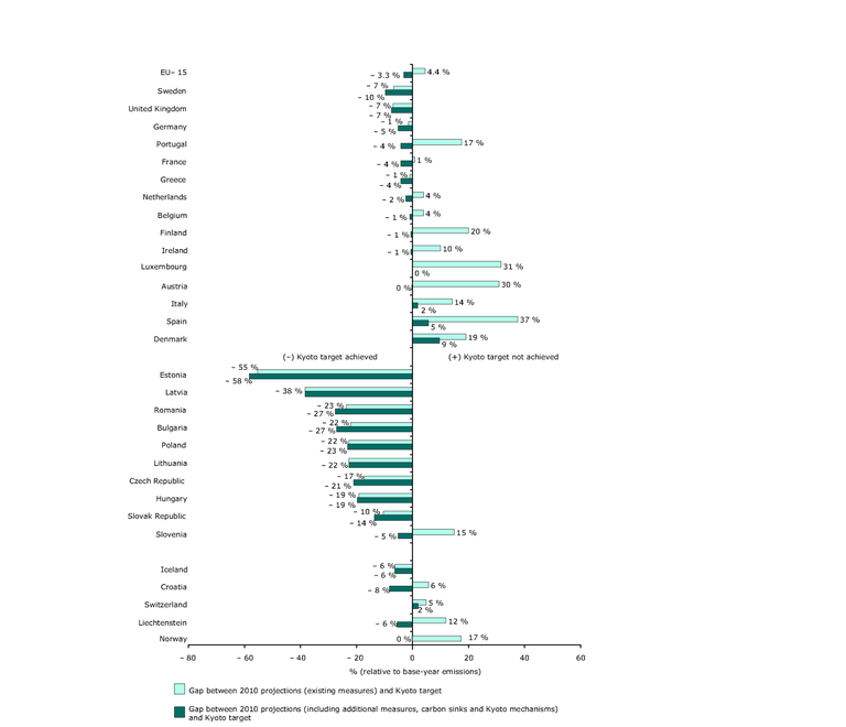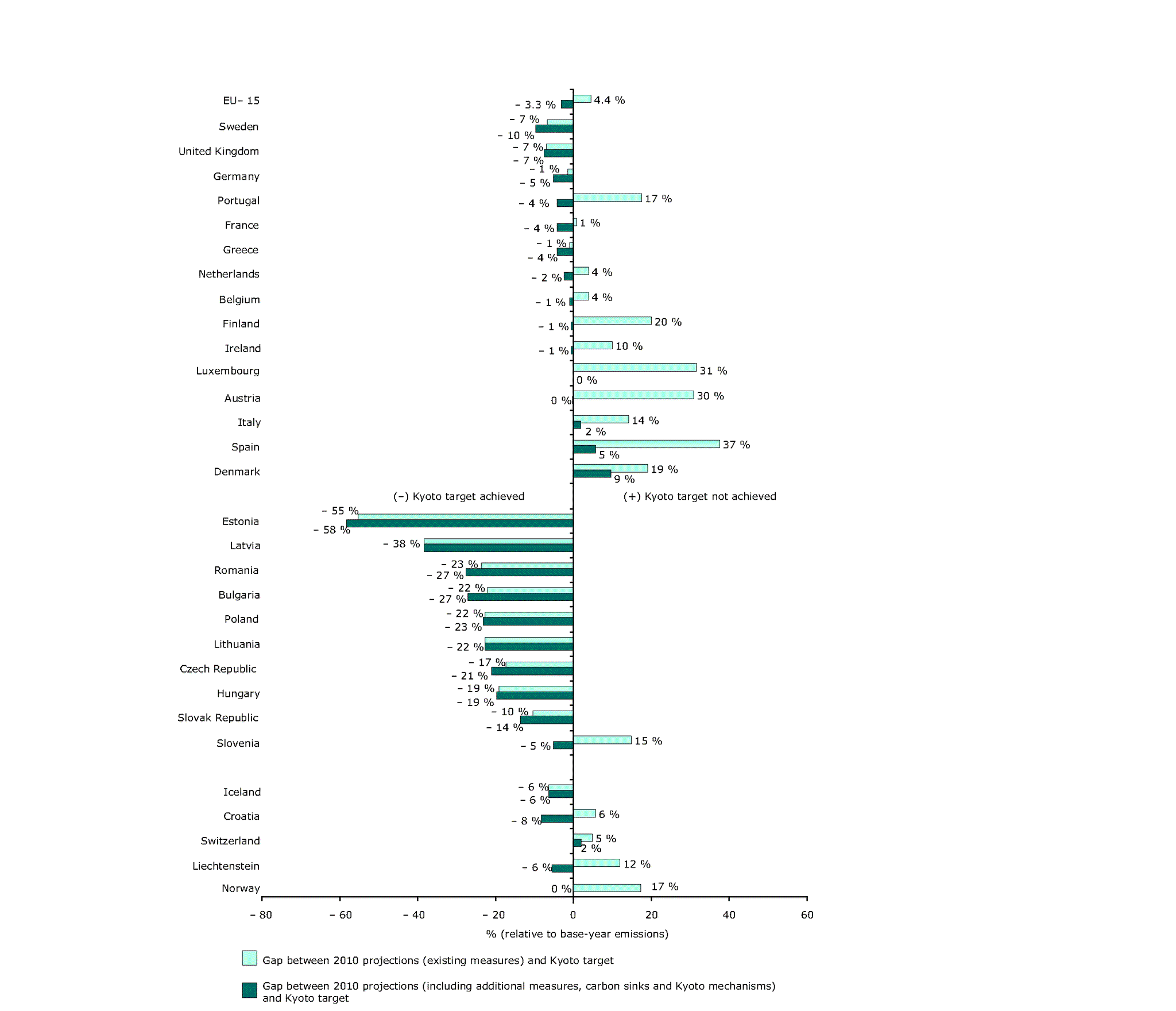 Gaps between EU Kyoto and burden-sharing targets and projections for 2010 for EU Member States, EU candidate countries and other EEA member countries