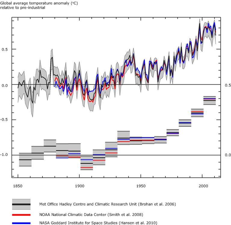 The lines refer to 10-year moving average, the bars to the annual 'land and ocean' global average.