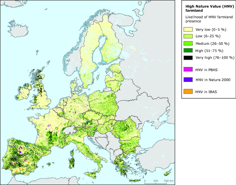 How to read the map: - green areas are likely to contain primarily HNV land, on the basis of a stratified selection of CORINE land cover classes per country and environmental zone, and national biodiversity data when available - violet areas are likely to contain primarily HNV land in selected Natura2000 sites - orange areas are likely to contain primarily HNV land in selected Important Bird Areas - pink areas are likely to contain primarily HNV land in Primary Butterfly Areas Since the layers are displayed on top of each other the more visible is the green one. The values in the map are a proxy for the proportion of HNV in each 1 km2 cell.