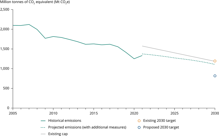 See all EU institutions and bodiesThis figure shows greenhouse gas emissions under the European Union Emissions Trading System (ETS) since the start of the system. It includes the cap on allowances, as well as the existing and proposed targets for 2030.