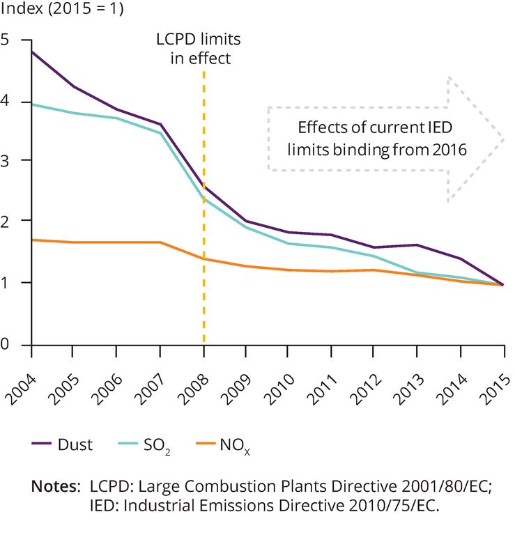 See all EU institutions and bodiesIndexed SO2, NOx and dust emissions from electricity generation for 2004 to 2015
