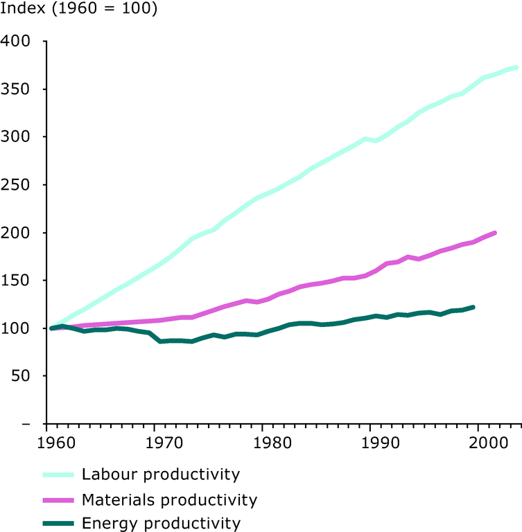 See all EU institutions and bodiesLabour productivity: GDP per annual working hours [1999 US$ (converted at EKS PPPs) per hour]; materials productivity: GDP per Domestic Material Consumption (DMC) [EUR per kg]; energy productivity: GDP per Total Primary Energy Supply (TPES) [thousand 1995 US$ per toe]