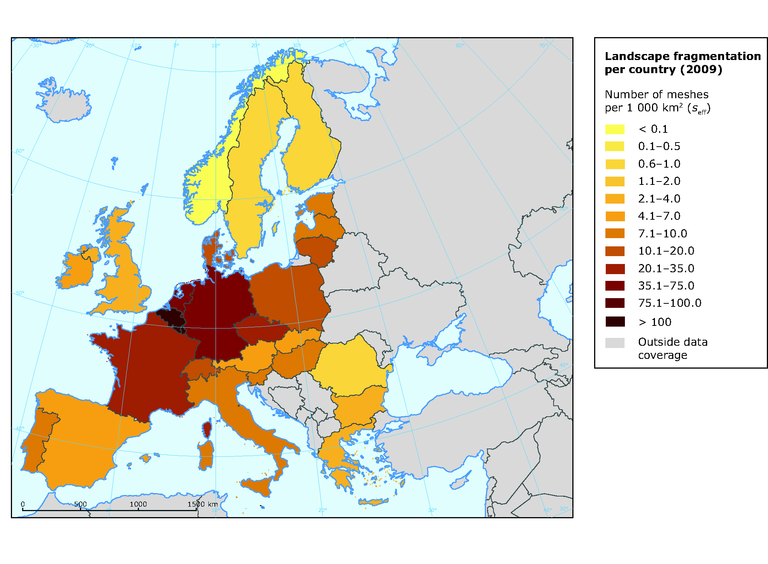 Landscape fragmentation per country in 2009