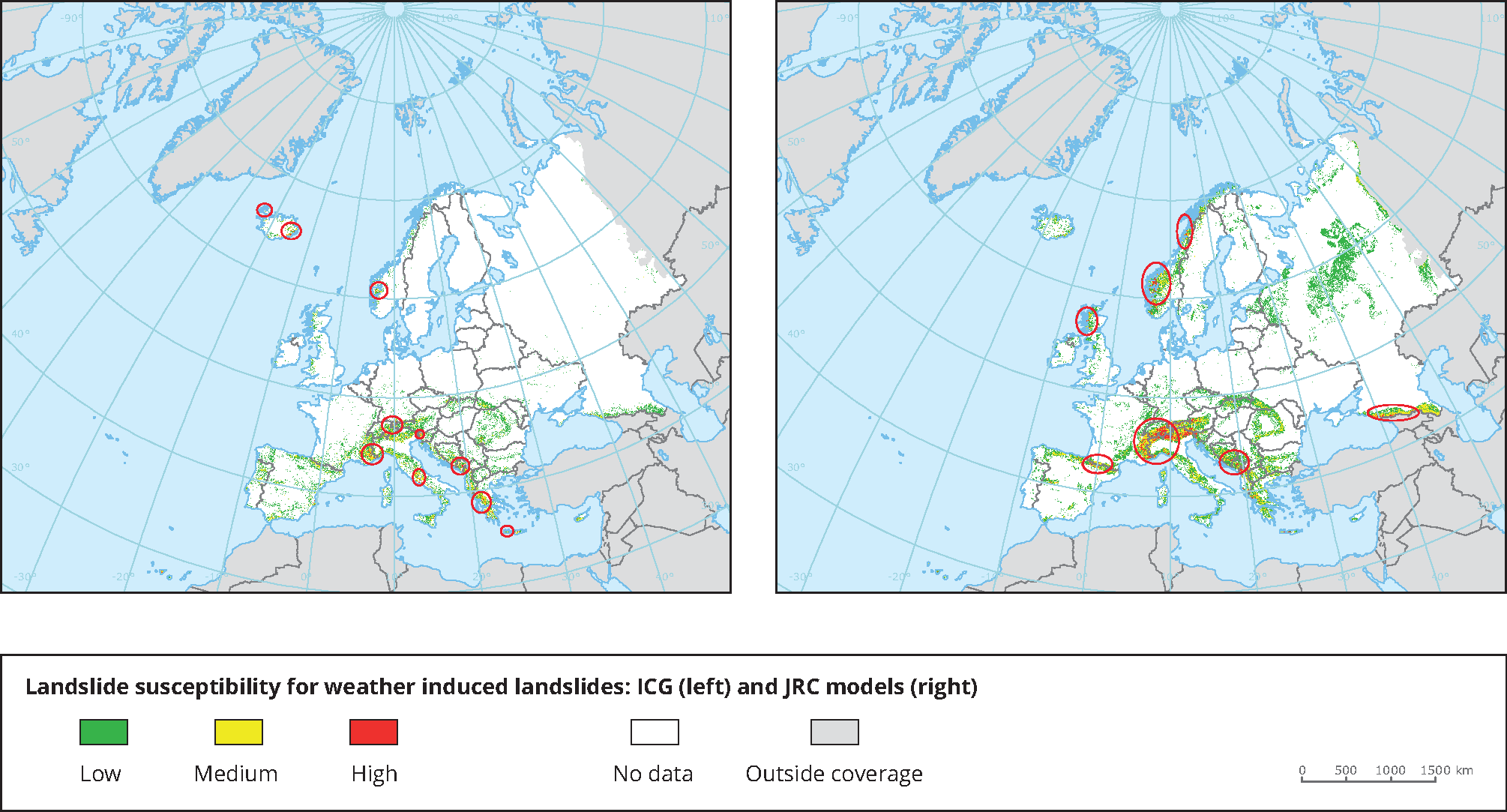 See all EU institutions and bodiesA distinct difference can be observed between the two models, where JRC model in general defines larger areas being exposed to landslides than the ICG model. This already shows that classification of landslide zonation maps is subjective and depends on the choice of the experts. The classified hazard map of JRC is definitely more conservative although it does incorporate hotspots of known hazard such as north-west Scotland, which the ICG model does not. Red circles show possible hotspots. White colour represent region without landslide hazard.