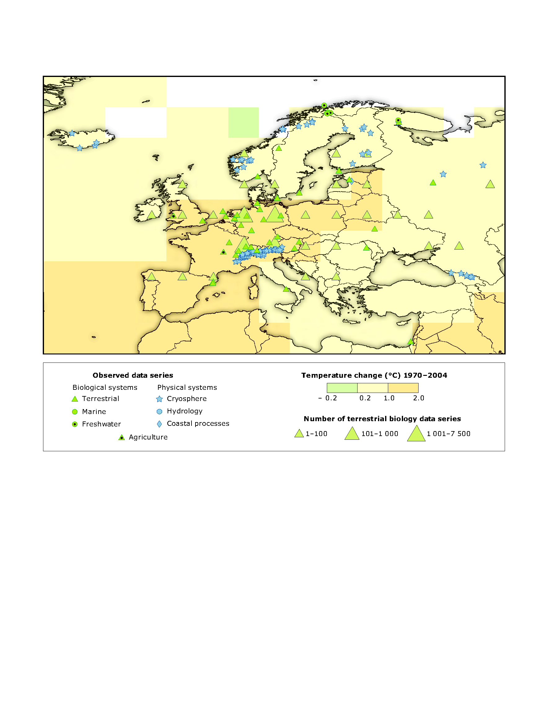 See all EU institutions and bodiesLocations of significant changes in data series of physical and biological systems, shown together with surface air temperature changes over the period 1970-2004