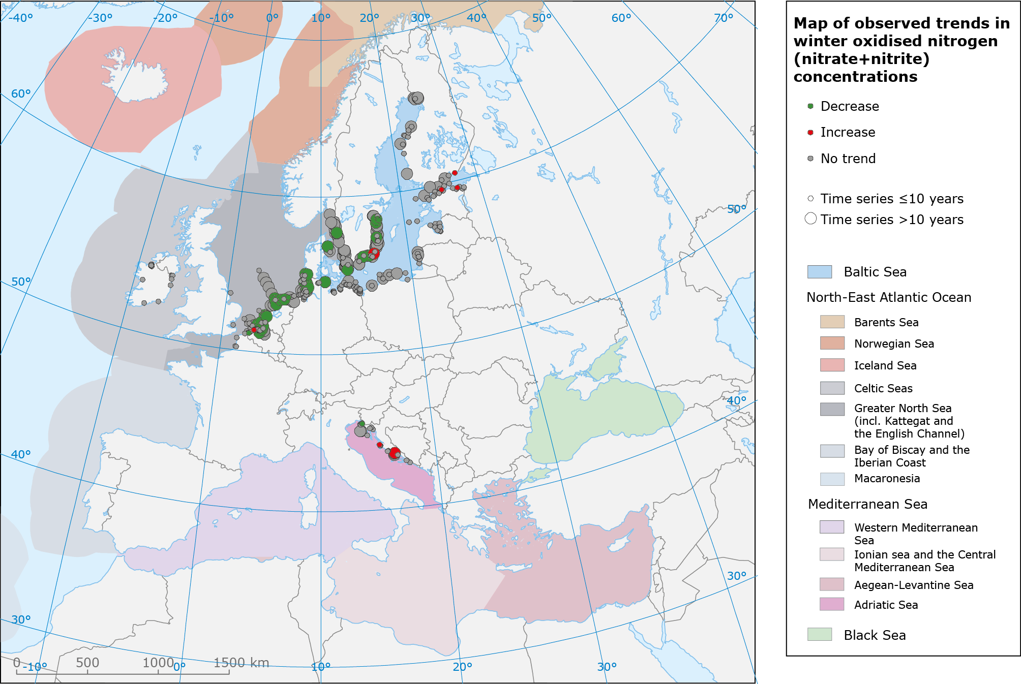 See all EU institutions and bodiesStations showing a statistically significant decrease (green), increase (red) or no trend (grey) of winter oxidised nitrogen concentrations within the period 1985 to 2012. Selected stations must have data, at least, in the period 2007-2012 and must have at least five years data in all.