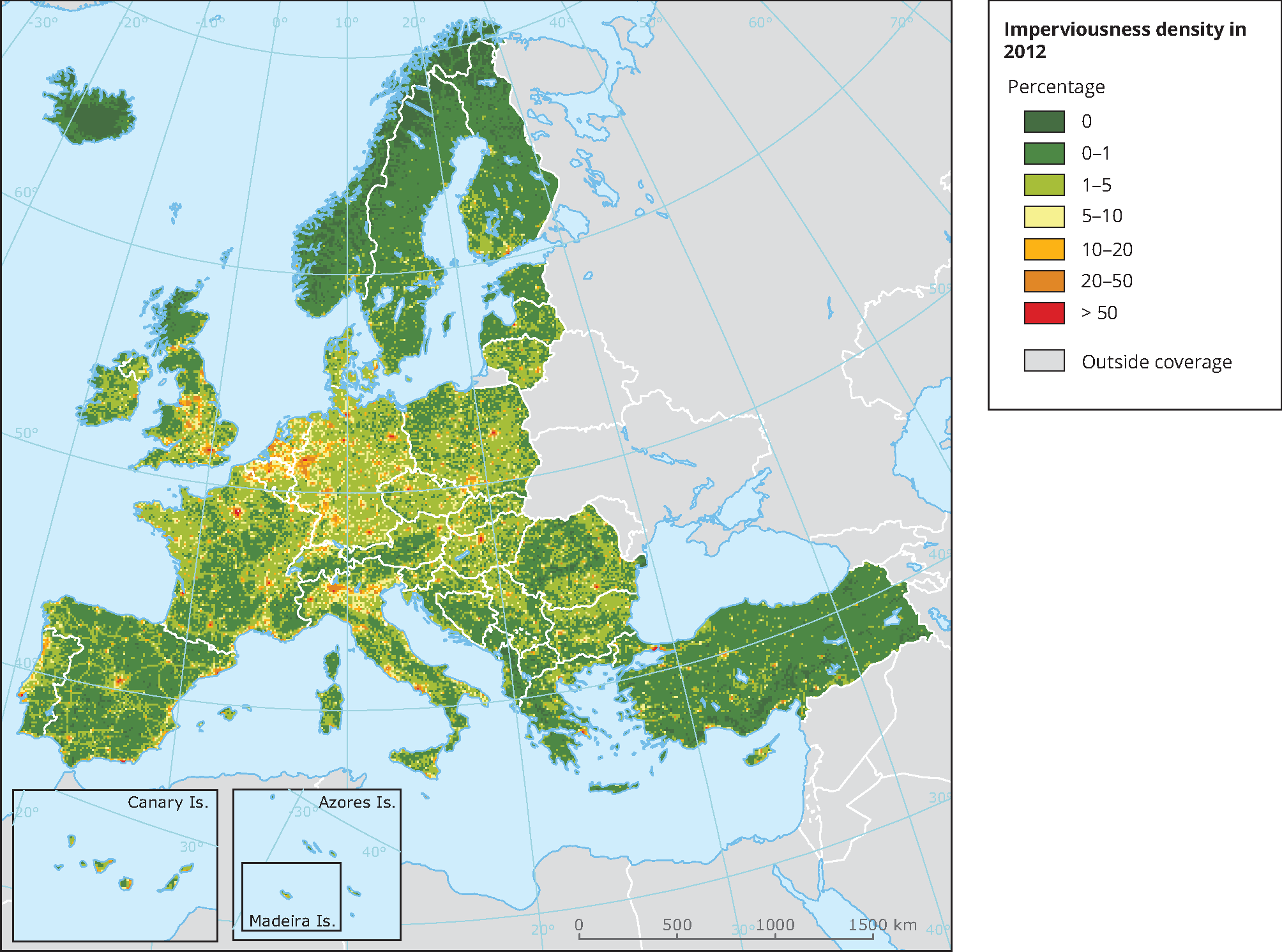The data is derived from aggregating the original Imperviousness 2012, 100m status layer, copyright by the Geoland2 project consortium.