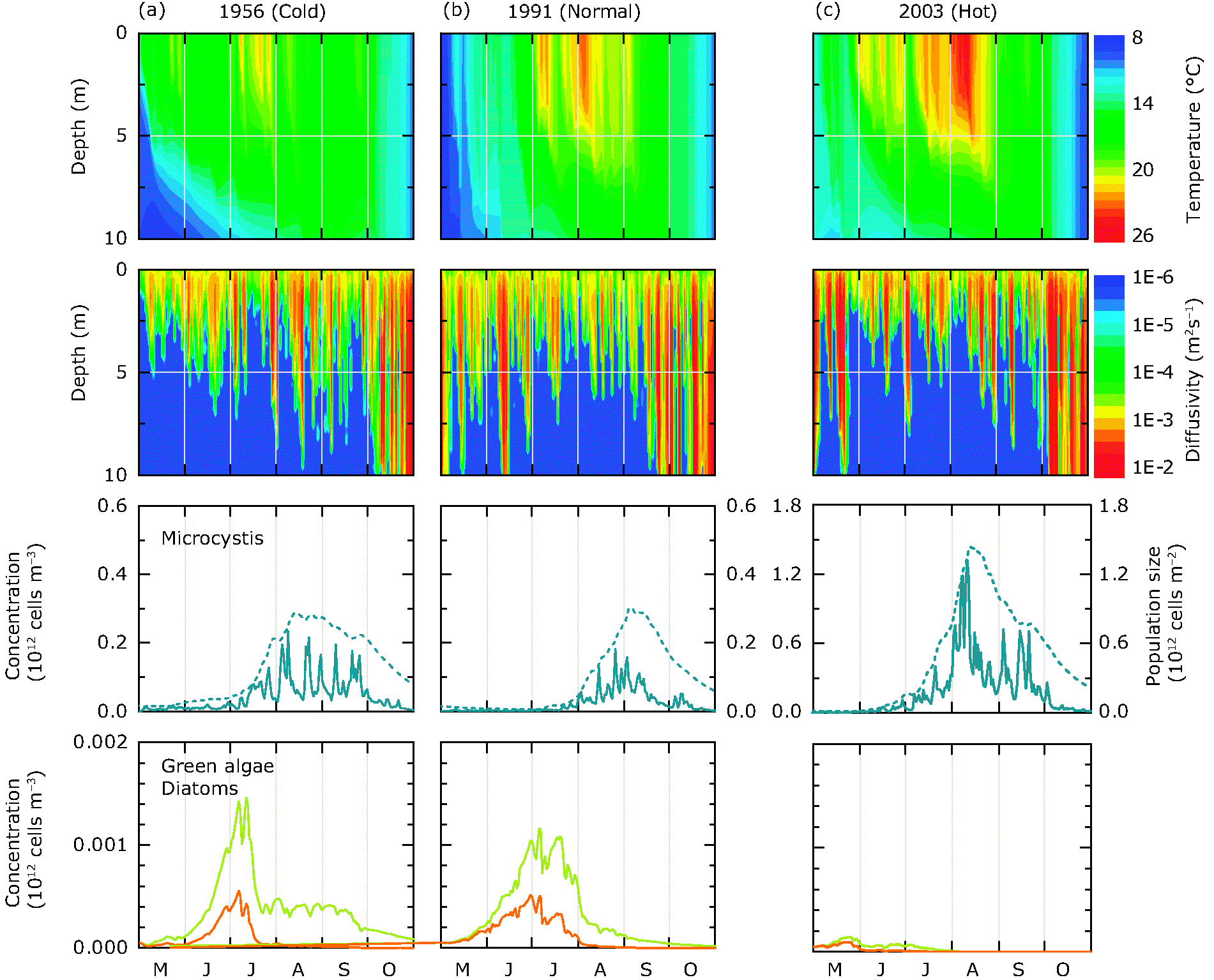 Top panels show the temperature contour plots. The second row shows contour plots of the turbulent diffusivities. The third row shows the surface concentrations of Microcystis (solid lines) and the depth-integrated population size of Microcystis (dashed lines). The fourth row shows the surface concentrations of diatoms (orange lines) and green algae (green lines). Note the difference in scale between the Microcystis concentrations (third row) and the concentrations of diatoms and green algae (fourth row).