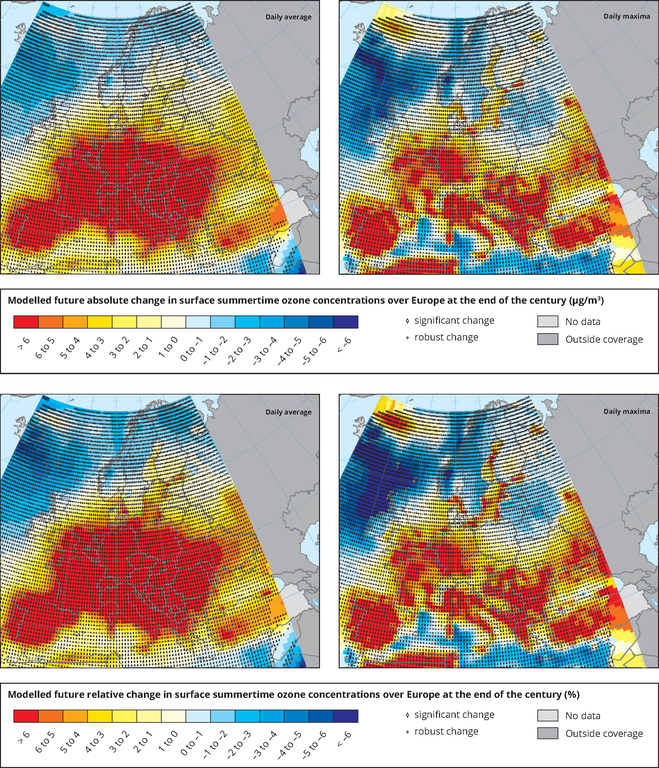 See all EU institutions and bodiesAbsolute and relative difference between future (2071-2100) and present (1960-2010) summertime average daily and maxima ozone levels in a 3 model ensemble. The modelled changes shown are only due to climate variability and climate change. A diamond sign is plotted where the change is significant, and a plus sign is added where the change is robust across two-third of modelled years.