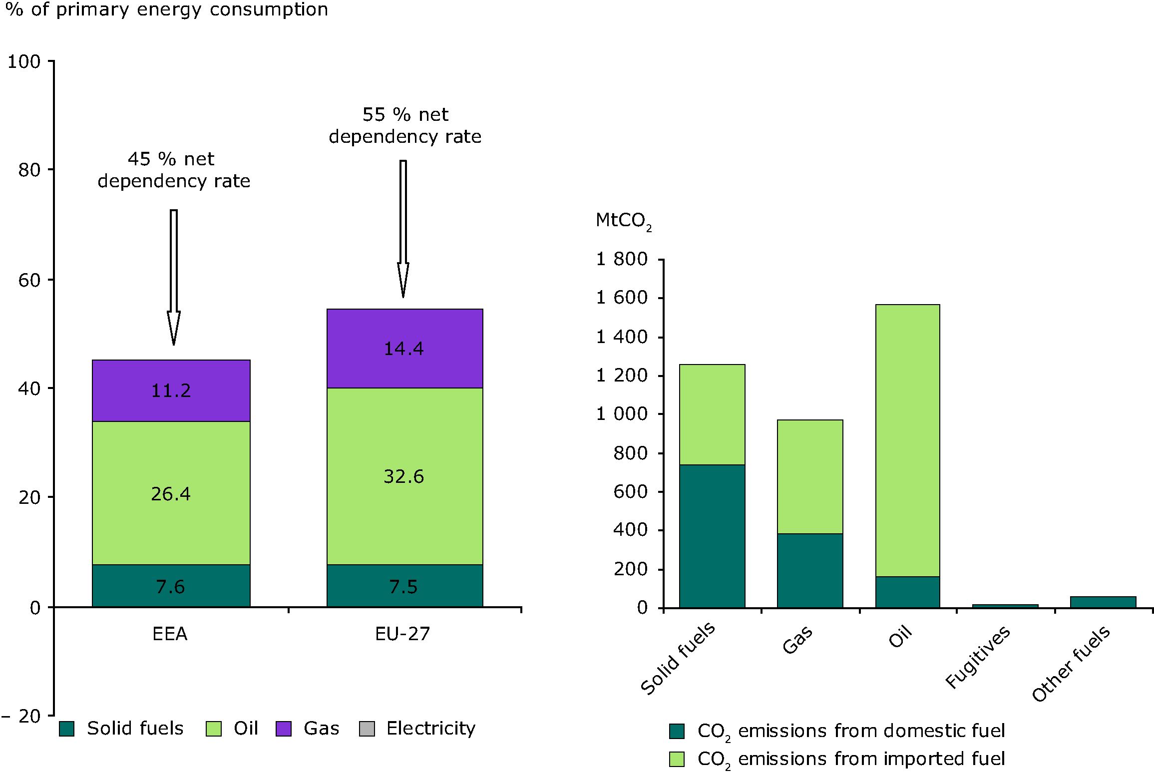 Emission Factors (tCO2/TJ) for Coal (97); oil (73); gas (57) multiplied by the level of net energy imports. All fugitive emissions and those from other fuels are assumed to be domestic; other fuels exclude CO2 from burning biomass in power plants.