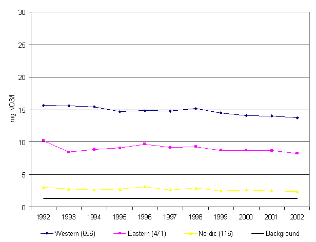 Number of stations in brackets. Eastern Europe: Bulgaria (50), Czech Rep. (58), Estonia (43), Hungary (89), Lithuania (57), Latvia (51), Poland (93), Slovak Rep. (9), Slovenia (21). Nordic countries: Finland (26), Sweden (90). Background concentrations of nitrate in rivers (about 1.3 mg NO3/l) are shown to aid the assessment of the significance of the nitrate concentrations (in association with the drinking water MAC). The time series comprise consistent data sets with no data gaps. For each time series the arithmetic mean of the station annual average concentrations was used in the regional aggregations.