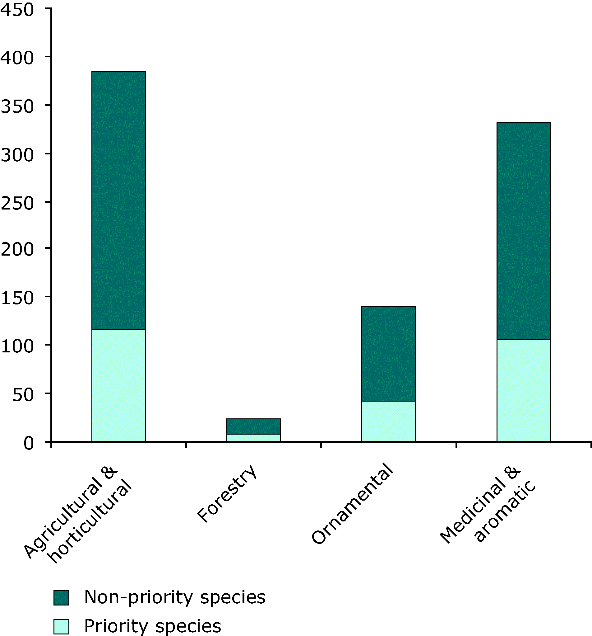From the CWR listed under the Habitats Directive, 60 % fall into the agricultural and horticultural crop group, 51 % in the medicinal and aromatic plant group, 22 % in the ornamental group and 4 % in the forestry group.