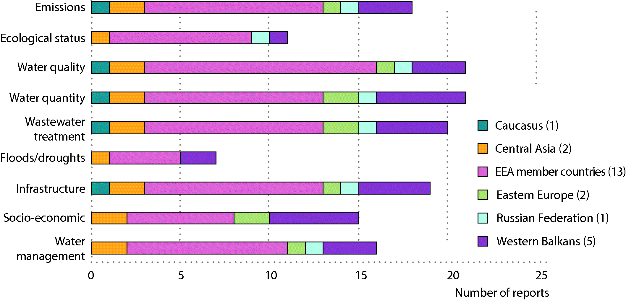 See all EU institutions and bodiesData from water assessments presented in the country fiches, based on 24 reports. The number of reports included in the assessment per region is indicated in brackets.