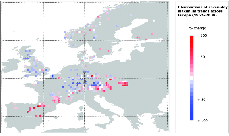 Observations of seven-day maximum trends across Europe (1962–2004)