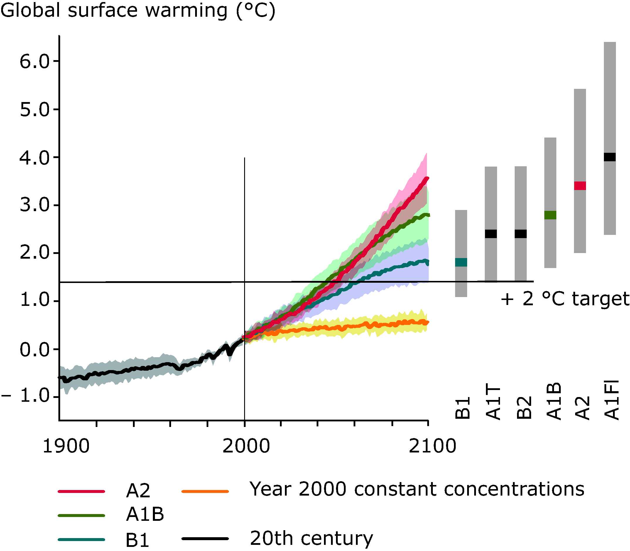 See all EU institutions and bodiesIf global greenhouse gas emissions would not be reduced, the 2°C target will be exceeded towards the middle of the 21st century. The horizontal 2°C target line takes into account warming of about 0.6 °C from pre-industrial to 1990. “Likely” ranges in average 2090-2099 warming for all six IPCC scenarios are shown on the right