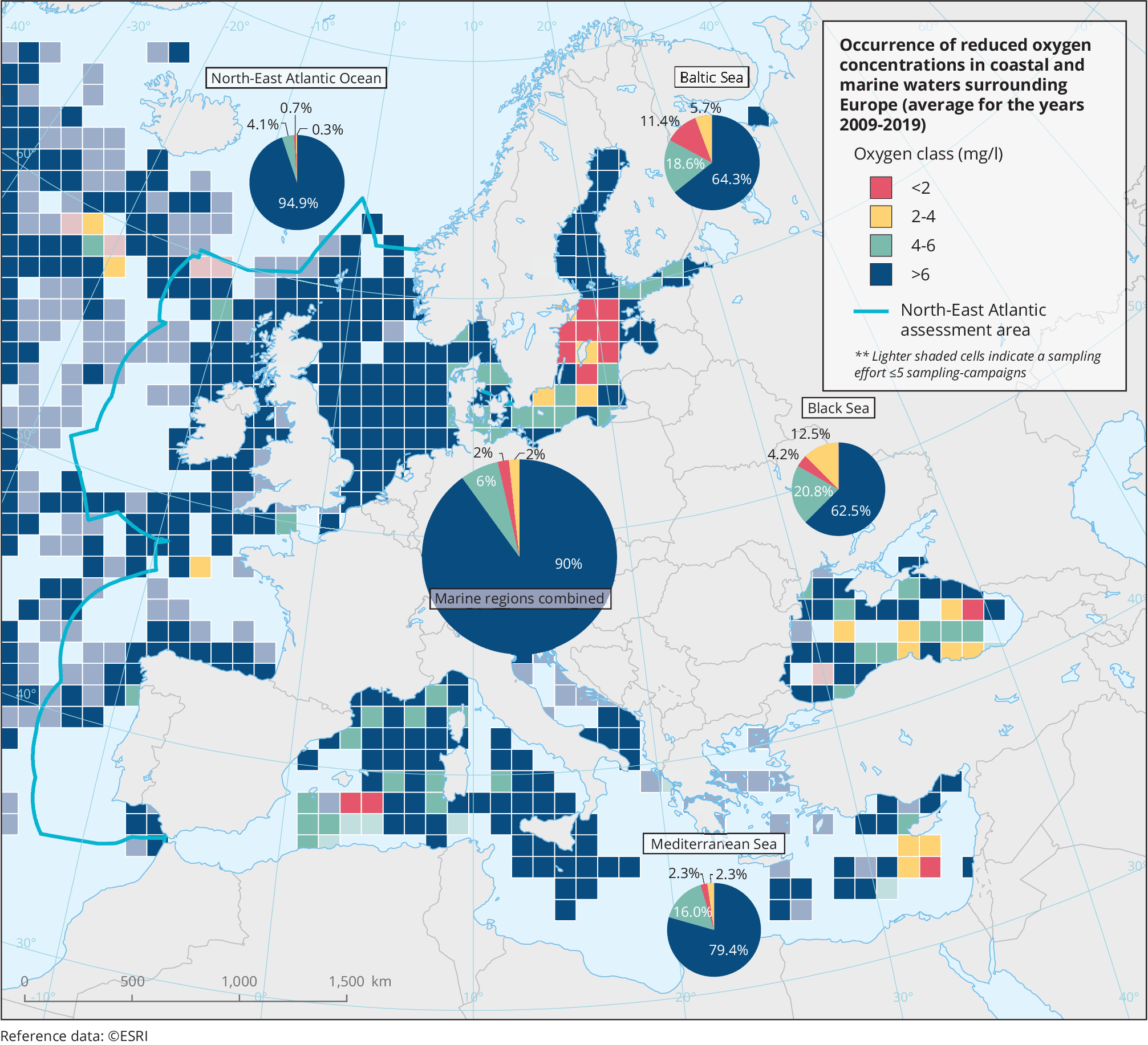 • The map shows the mean 25-percentile of dissolved oxygen (DO) concentrations in near-bottom waters during summer-autumn months over the period 2009-2019, by grid cell (EEA 100*100km grid).