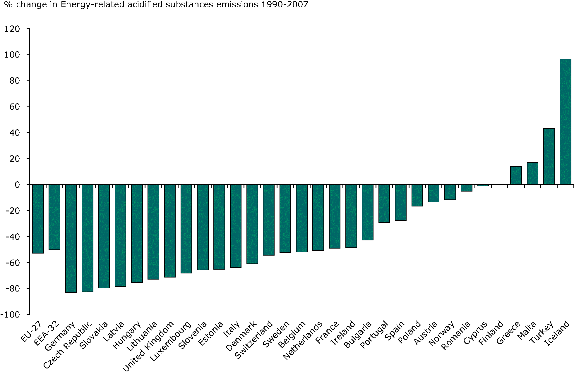 See all EU institutions and bodiesThe graph shows the change in emissions of acidifying pollutants (sulphur dioxide SO2, nitrogen oxides NOx and ammonia NH3) each weighted by an acid equivalency factor prior to aggregation to represent their respective acidification potentials. The acid equivalency factors are given by: w(SO2) = 2/64 acid eq/g = 31.25 acid eq/kg, w(NOx) = 1/46 acid eq/g = 21.74 acid eq/kg and w(NH3) = 1/17 acid eq/g = 58.82 acid eq/kg.