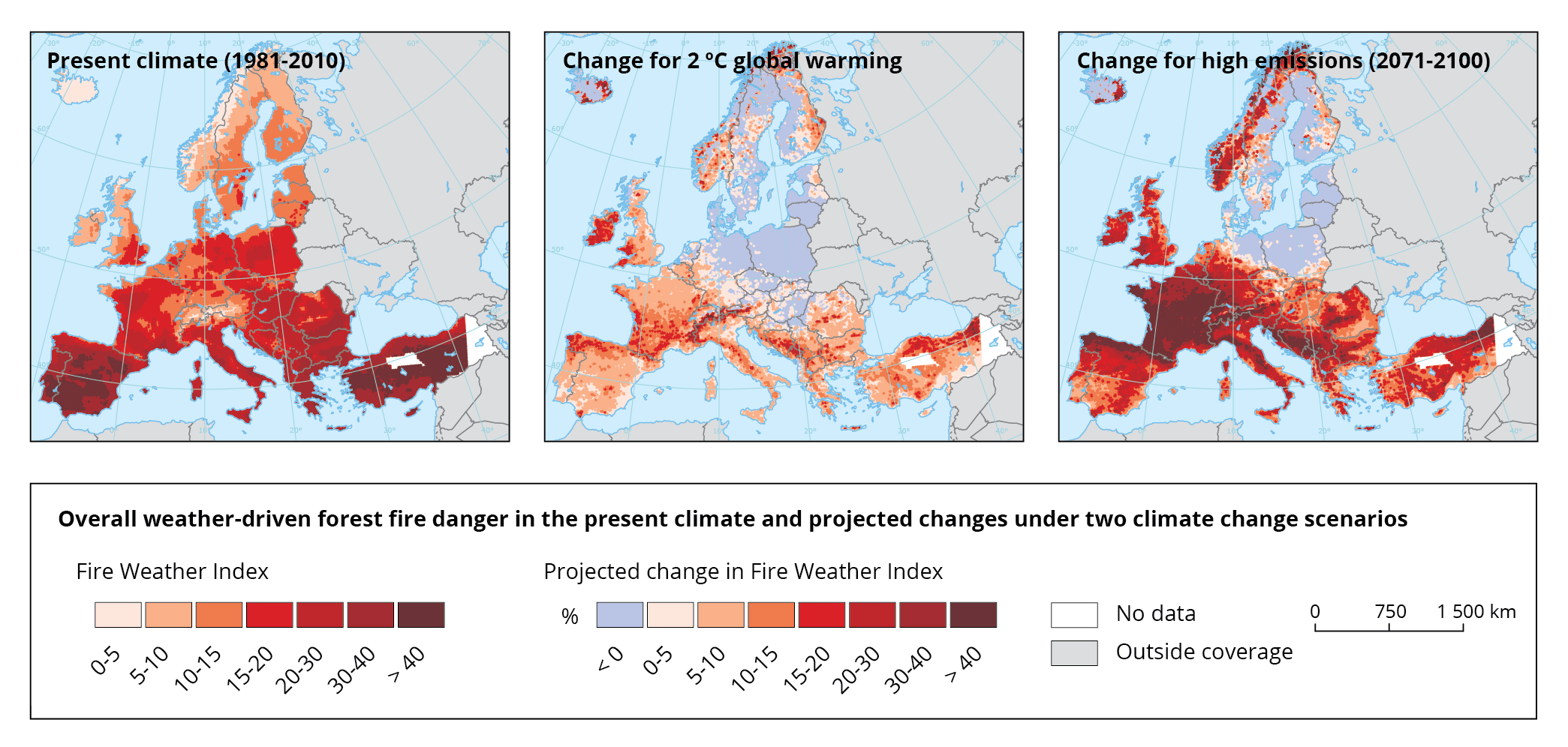 Adapted from Figure 8 of: de Rigo, D., Libertà, G., Houston Durrant, T., Artés Vivancos, T., San-Miguel-Ayanz, J., 2017. Forest fire danger extremes in Europe under climate change: variability and uncertainty. Publication Office of the European Union, Luxembourg, 71 pp. ISBN: 978-92-79-77046-3 , https://doi.org/10.2760/13180