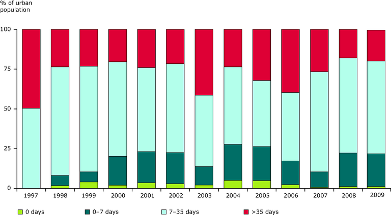 Data for Bosnia and Herzegovina, Iceland, Liechtenstein, Luxembourg, Malta, the former Yugoslav Republic of Macedonia, Serbia, and Turkey are not included due to the geographical coverage of the Urban Audit and/or lack of air quality data.