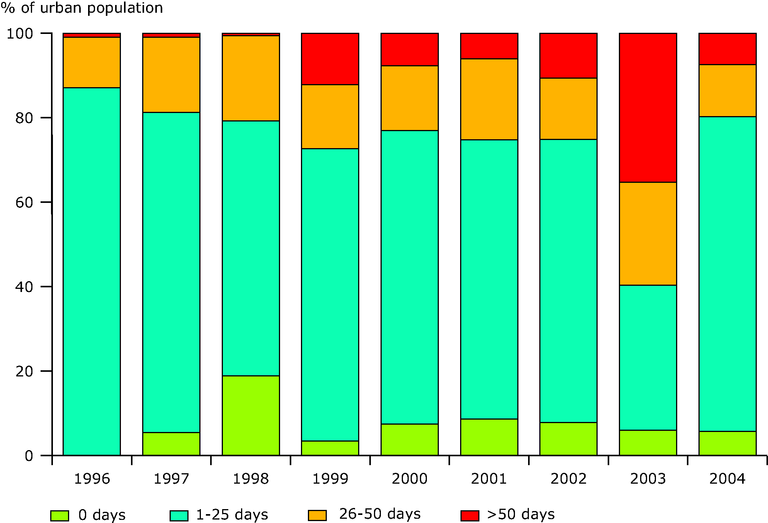 Data prior to 1996 with a coverage of less than 50 million people are not representative for the European situation. Year-to-year variations in exposure classes are partly caused by the changes in spatial coverage.