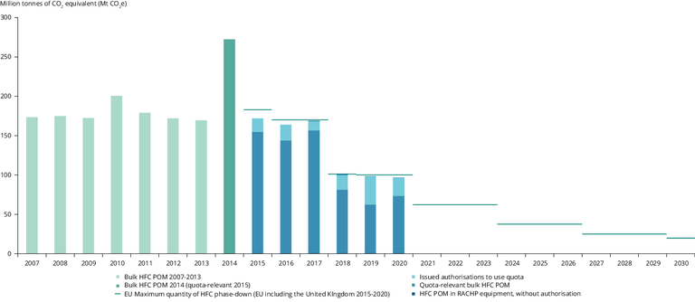 The geographical scope of presented POM data is the EU-28 except Croatia for 2007-2008 and the EU-28 for 2009-2019. The maximum quantities of the EU HFC phase-down shown for 2019 onwards are given for the EU-27 and the United Kingdom. EU-27 maximum quantities for 2020 onwards will need to be recalculated for the period after the Brexit transition period.
