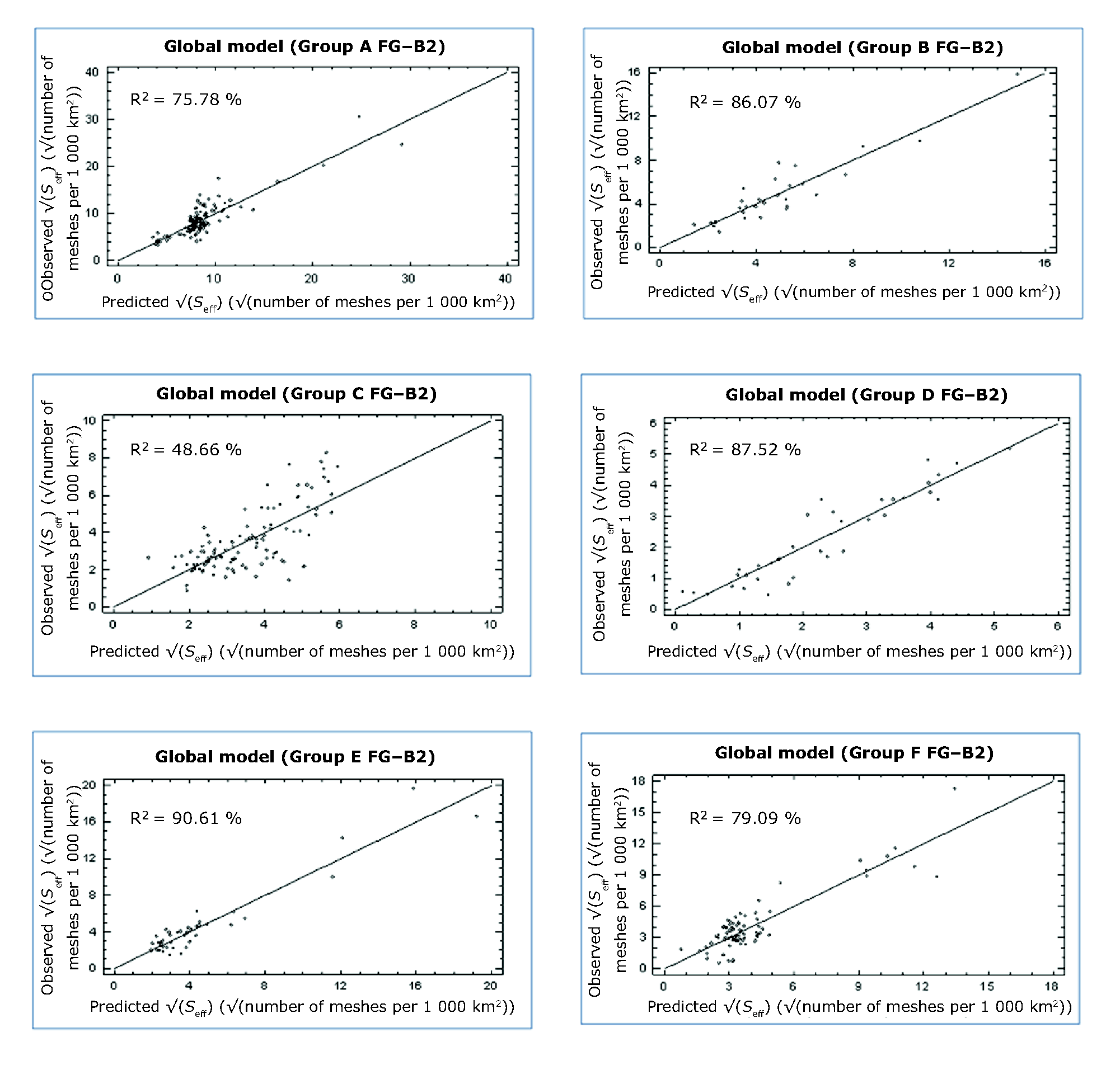 See all EU institutions and bodiesEffective mesh density values by NUTS-X region for Fragmentation Geometry FG-B2 in 2009. The NUTS-X regions represented by points above the diagonal line are more fragmented than predicted and those represented by by points below the diagonal line are less fragmented than predicted. All models shown include all available variables in each group and use a square root transformation for seff.