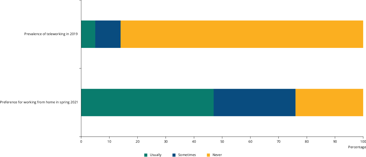 Prevalence of teleworking pre-pandemic and preference for working from home in spring 2021, EU-27 (%)