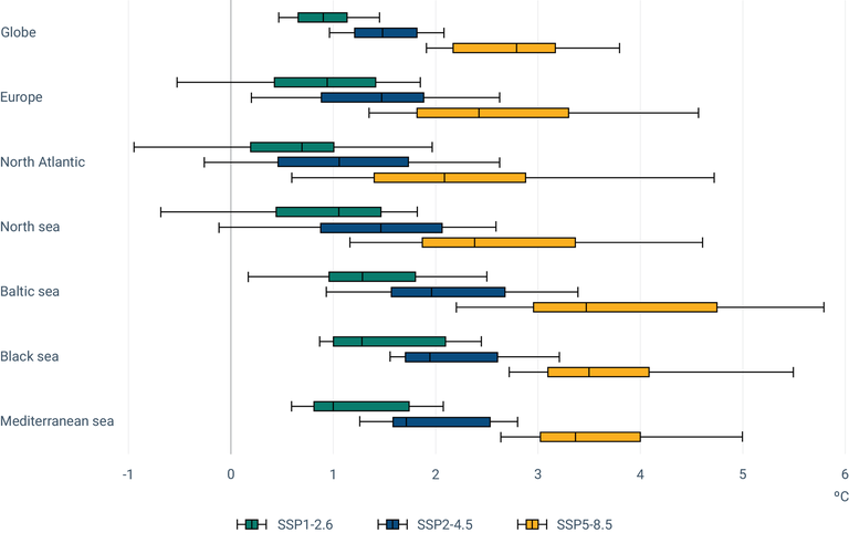 CMIP6 models (32 for SSP1-2.6, 32 for SSP2-4.5 and 22 for SSP5-8.5) are spatially averaged in their native grid for each of the European seas and the global ocean. The anomaly is computed against the model's period 1991-2010, then the 30-year climatology for 2070-2100 of each model is included to construct the boxplots showing 5th, 25th, 50th, 75th and 95th percentiles. SSP scenarios (Shared Socioeconomic Pathways) are the new scenarios representing different socio-economic developments as well as different pathways of atmospheric greenhouse gas concentrations. Five narratives describe different path of economy and society (SSP1-SSP5) from the sustainable and “green” pathway (SSP1) to fossil-fueled development and integration of global markets (SSP5). Individual scenarios are followed by two numerals indicating the additional radiative forcing achieved by the year 2100 in units of watts per square meter. For the sake of simplicity, only scenarios SSP1-2.6, SSP2-4.5 and SSP5-8.5 are used in Figure 2.