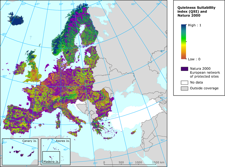 Suitable distance layer from noise sources built following a fuzzy approach (*), calculating the 'membership' to the quietness range (0–1) by means of a linear relationship, considering the mean value obtained as no suitable (= 0) and maximum distance obtained as suitable (= 1). The distance values between not suitable (mean value) and suitable (maximum value) will be reassigned with a new value between 0 and 1 following a linear equation. The noise map has been combined with the Natura 2000 data for Europe.