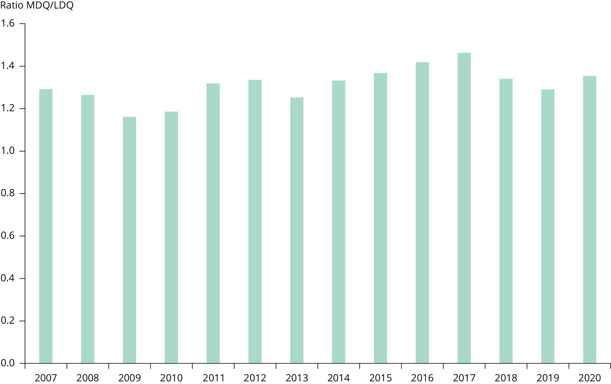See all EU institutions and bodiesThe graph shows the ratio of the annual average population weighted concentration of PM₂.₅ in the poorest quintile divided by that of the richest quintile of NUTS3 regions in the EU, as measured by Gross Domestic Product (GDP) per capita at purchasing power standard, per year.