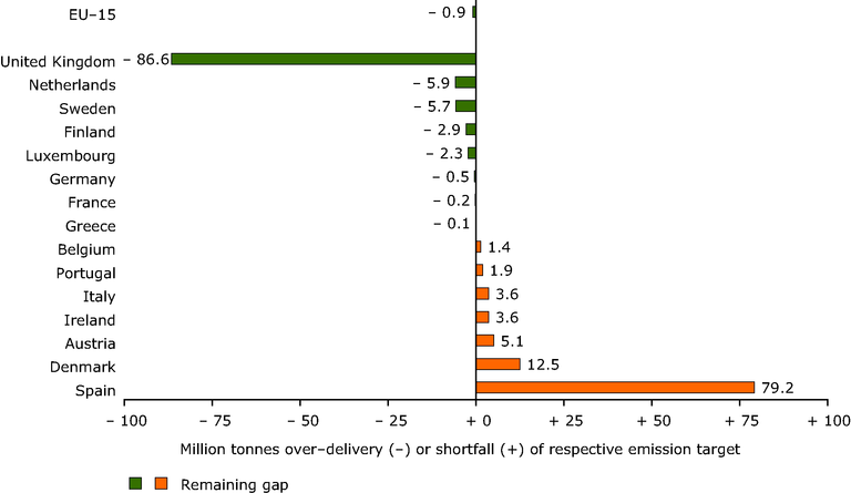 Remaining gap (over-delivery or shortfall) in absolute terms including the effects of additional policies and measures, Kyoto mechanisms and carbon sinks