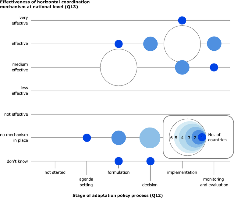 See all EU institutions and bodiesThe graph combines information on countries' perceptions on the effectiveness of their horizontal coordination mechanism together with information on the stage of their adaptation policy process. Bubble sizes indicate the number of countries in a given stage of adaptation policy process with a similar perception of the effectiveness of their horizontal coordination mechanism.