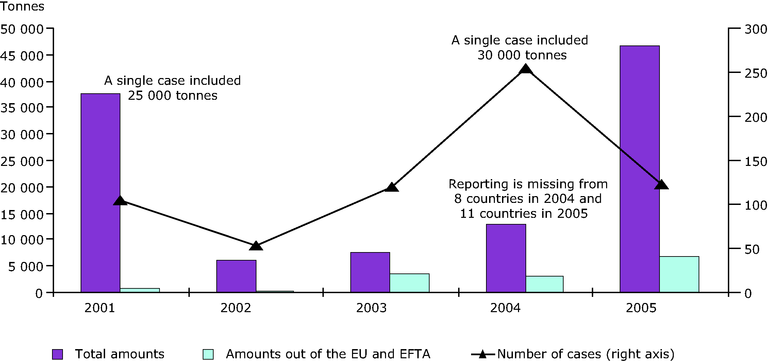 Note: In the years 2001 to 2003 the reporting covers only the old EU Member States, but three countries did not report.