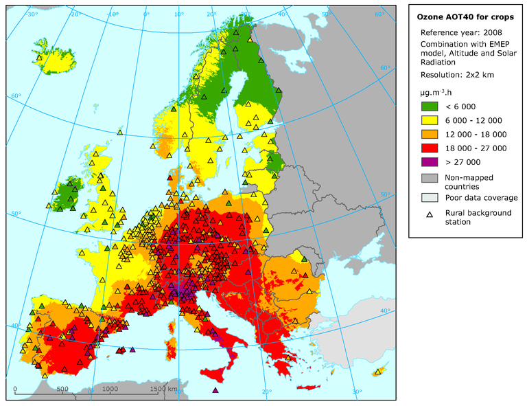 AOT40 means the sum of the differences between hourly concentrations greater than 80 µg/m3 (= 40 parts per billion) and 80 µg/m3