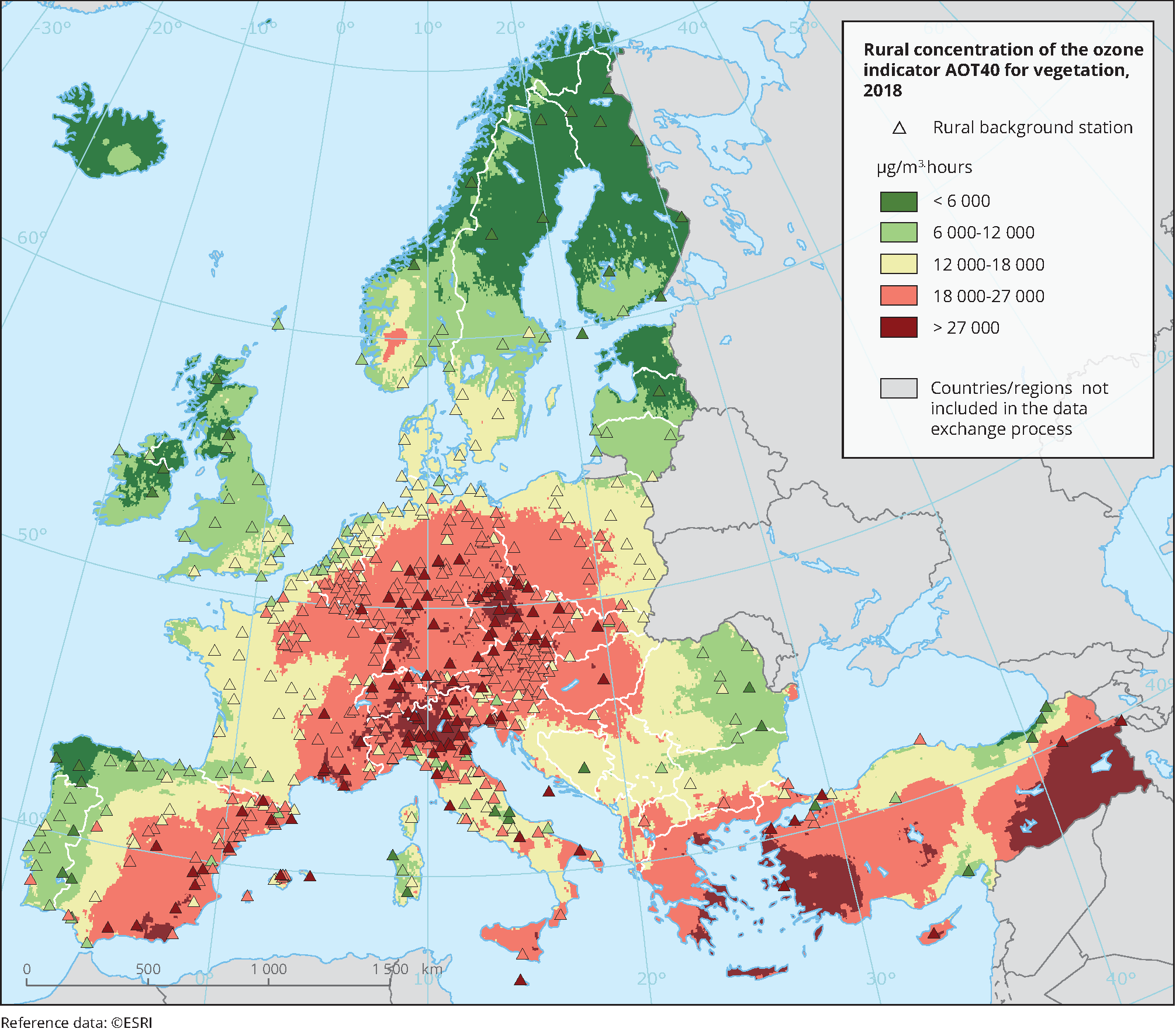 See all EU institutions and bodiesAccumulated ozone exposure values for vegetation and crops — over a threshold of 40 parts per billion (AOT40c) — for 2018, as calculated for the fusion maps and as measured at rural background stations.