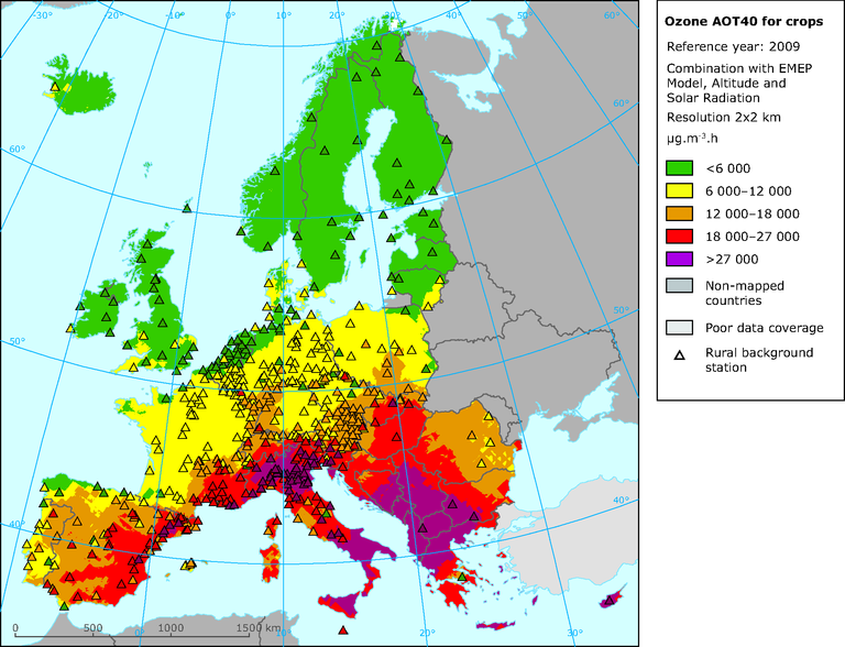 AOT40 means the sum of the differences between hourly concentrations greater than 80 µg/m3 (= 40 parts per billion) and 80 µg/m3