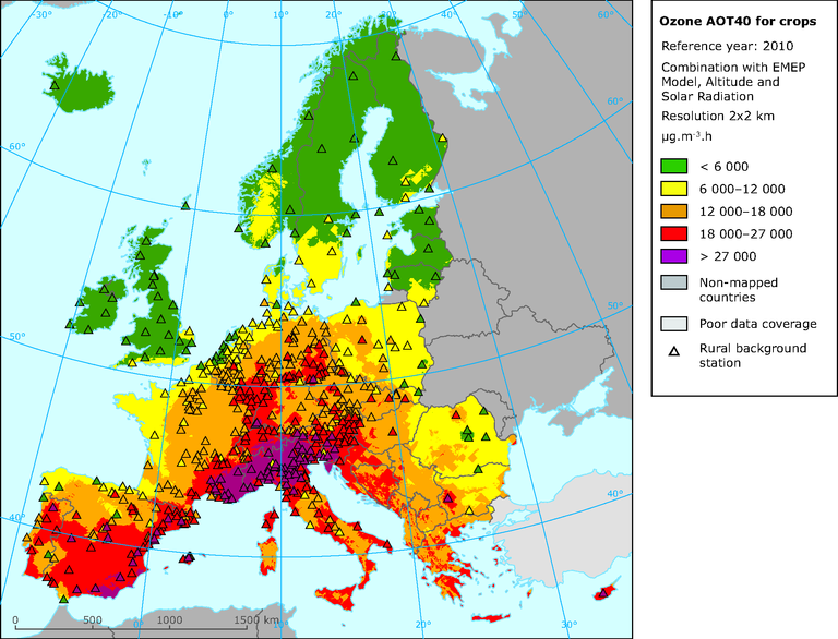 AOT40 means the sum of the differences between hourly concentrations greater than 80 µg/m3 (= 40 parts per billion) and 80 µg/m3