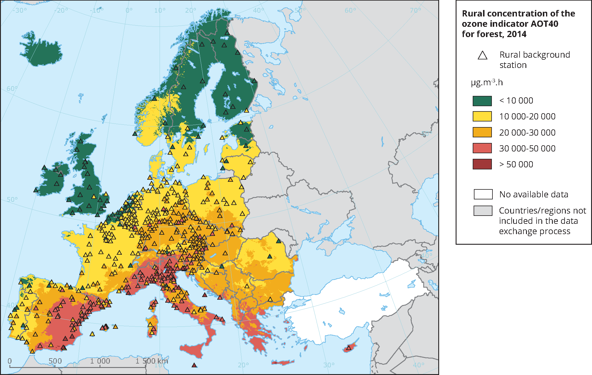 AOT40 means the sum of the differences between hourly concentrations greater than 80 µg/m3 (= 40 parts per billion) and 80 µg/m3