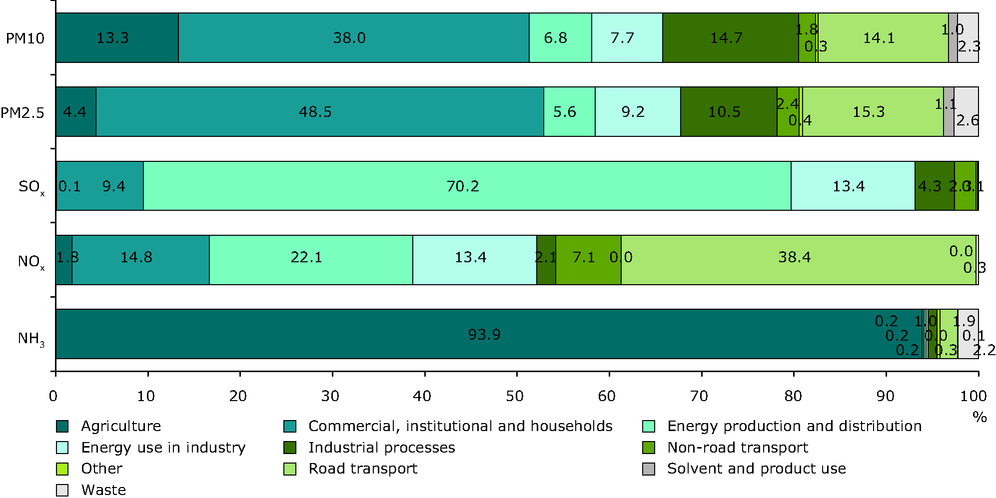 See all EU institutions and bodiesThe contribution made by different sectors to emissions of primary PM2.5 and PM10, and to emissions of the secondary particulate matter precursors.