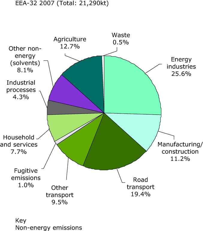 The graph includes the combined emissions of primary PM10 particles (particulate matter with a diameter of 10 μm or less, emitted directly into the atmosphere) and secondary particulate-forming pollutants (the fraction of sulphur dioxide, SO2, nitrogen oxides NOx and ammonia NH3 which, as a result of photo-chemical reactions in the atmosphere, transform into particulate matter with a diameter of 10μm or less). Emissions of the secondary particulate precursor species are weighted by a particle formation factor prior to aggregation: primary PM10 = 1, SO2 = 0.54, NOx = 0.88, and (NH3) = 0.64.