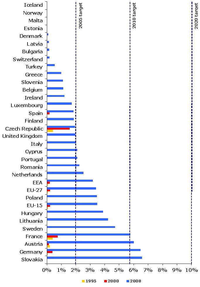 Under Directive 2003/30/EC Europe established the goal of reaching a 2% in 2005 and 5.75% share of renewable energy in the transport sector by 2010. As it is interesting to monitor the evolution of the share of biofuels against goals, these two targets are maintained even though they are not longer valid. Under the new directive on the promotion of renewable energy (2009/28(EC that repeals the previous ones), this share rises to a minimum 10% in every Member State in 2020. The new directive on renewable energy also aims to ensure that as we expand the use of biofuels in the EU we use only sustainable biofuels, which generate a clear and net GHG saving and have no negative impact on biodiversity and land use. The graph represents the share of biofuels as the share of renewable sources in the transport sector, even though other renewable sources could eventually contribute.