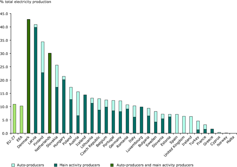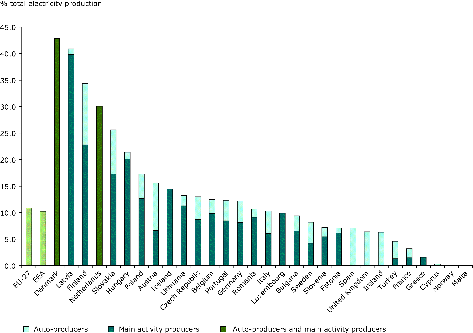 The share is defined as the proportion of CHP electricity production in total electricity production. Note, however not all electricity production from a CHP ‘plant’ may be considered as CHP production as the plant may consist of different types of units (such as heat only, or flexible units where the power-to-heat ratio may be adjusted). The method for data collection by Eurostat on CHP was revised in an earlier version of the factsheet to account for this (as it had previously tended to overestimate the share of electricity generation from CHP) and is described in more detail in the metadata section. Therefore, the current share is not directly comparable to the 18 % target outlined in 1997 by the European Commission (COM (97) 514 final). The division in auto-producers and main activity producers is unknown for Denmark, and The Netherlands.