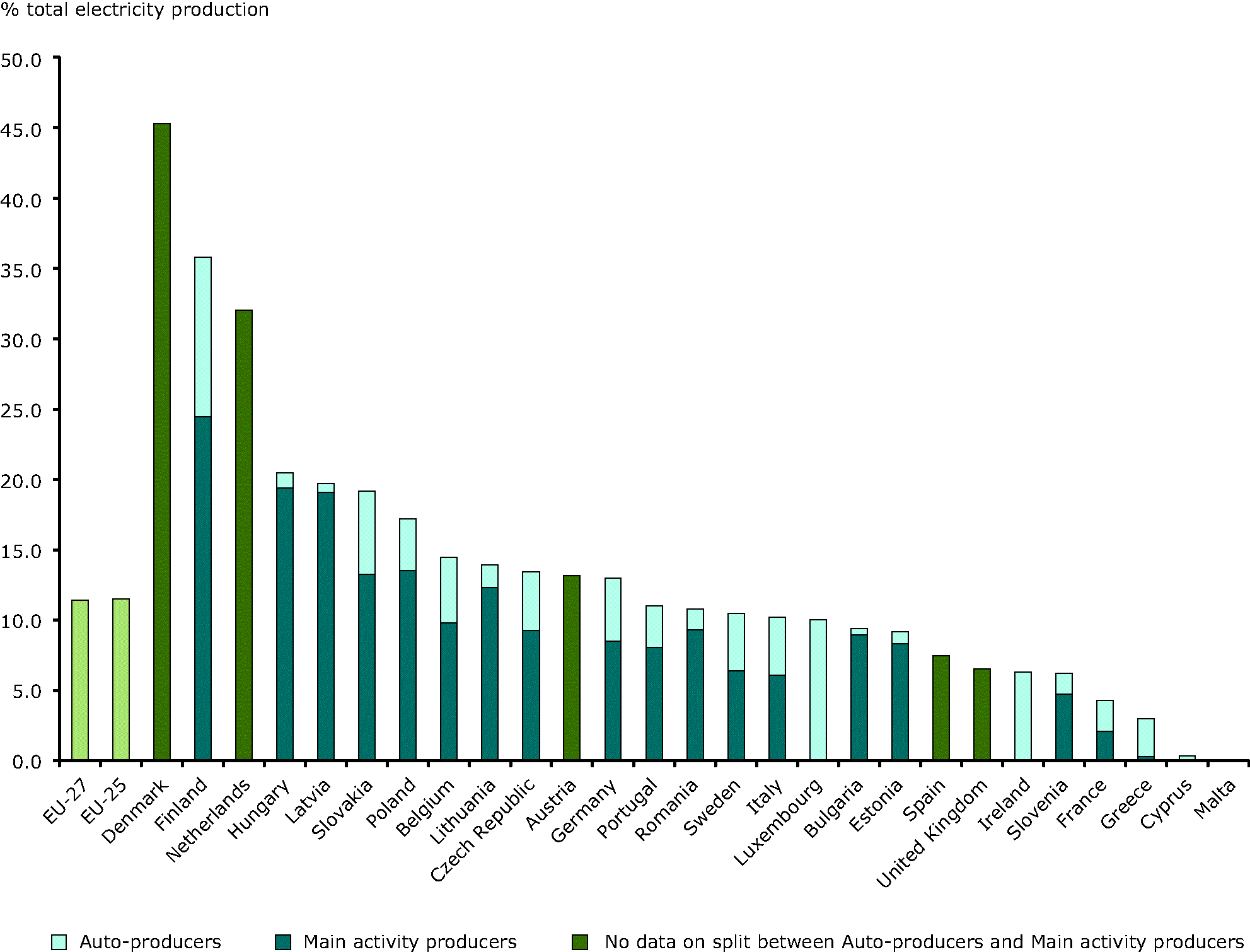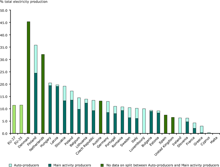 The share is defined as the proportion of CHP electricity production in total electricity production. Note, however not all electricity production from a CHP ‘plant’ may be considered as CHP production as the plant may consist of different types of units (such as heat only, or flexible units where the power-to-heat ratio may be adjusted). The electrical output of CHP is that part which related to the CHP process, as defined by the CHP Directive (2004/8/EC). The division in auto-producers and main activity producers is unknown for some counties, such as Denmark, as well as other Member States due to the interpretation of the definition applied. The single colour purple in the bars show the countries with the highest data uncertainty. For instance, in the UK, at least 30% of CHP is operated by electricity companies (Challoch Energy assessment for this indicator).