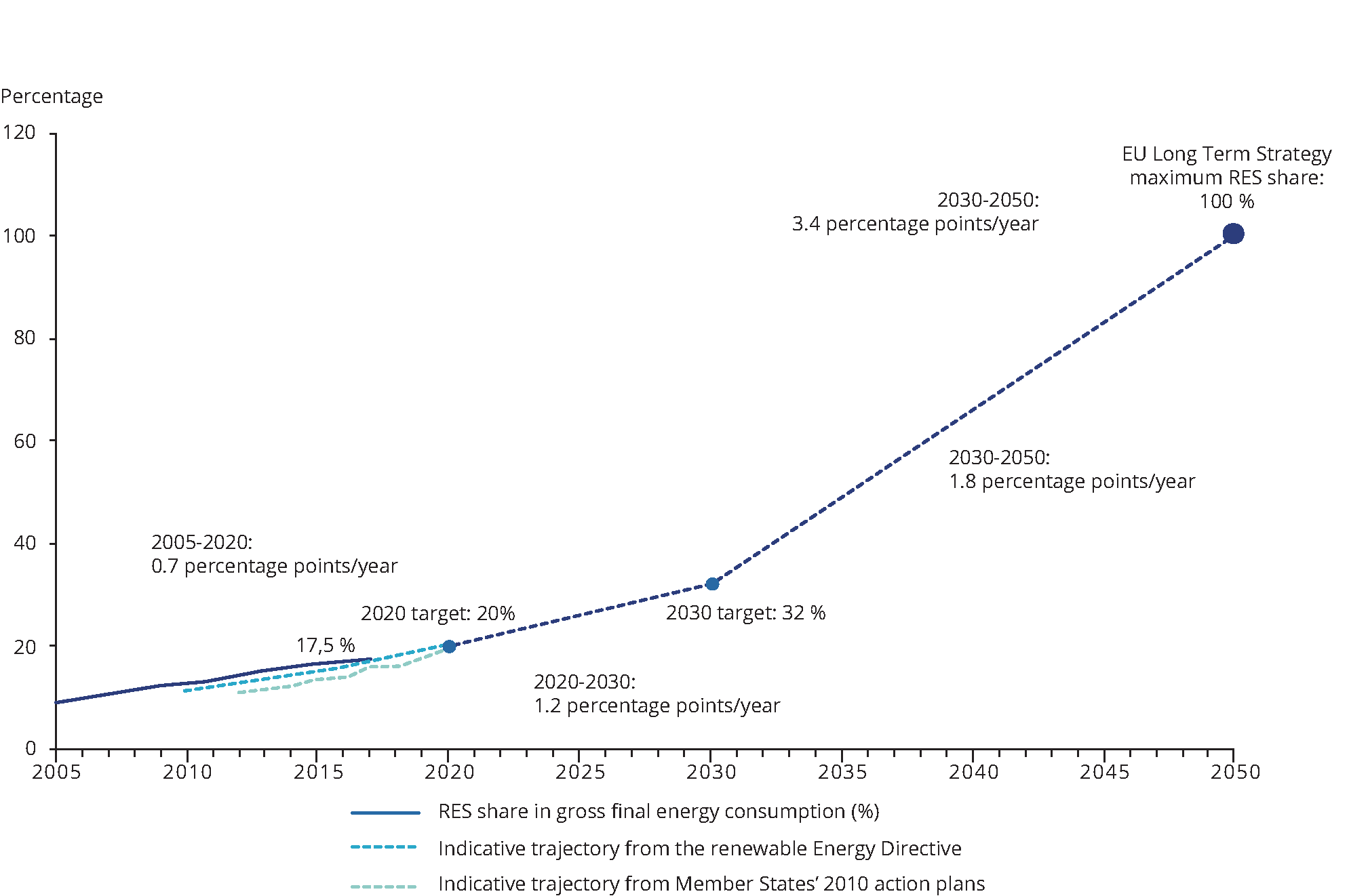 See all EU institutions and bodiesThe solid line shows the development of the share of renewables in EU energy consumption based on historic data. The dashed lines show expected progress to 2020 based on projection data. The dots illustrate the 2020, 2030 targets.The 2050 scenario range illustrates the an average of eight scenarios published in the Commission's 2050 long term strategy.