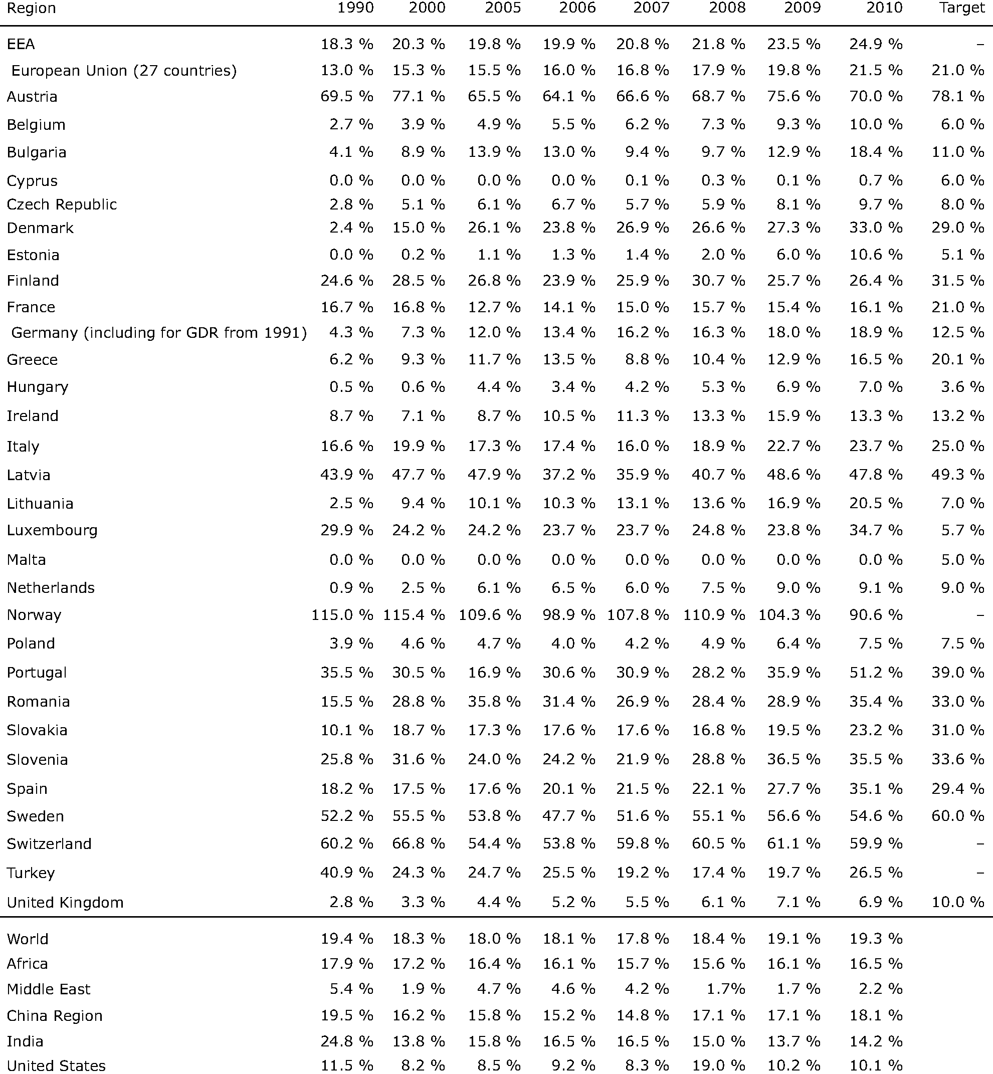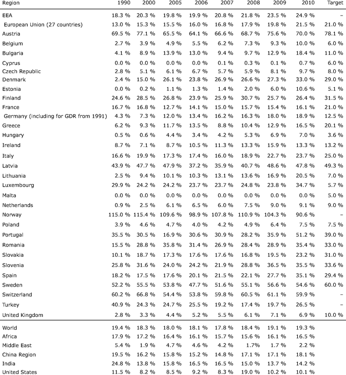 The renewable electricity directive (2001/77/EC) defines renewable electricity as the share of electricity produced from renewable energy sources in total electricity consumption. The latter includes imports and exports of electricity. The electricity generated from pumping in hydropower plants is included in total electricity consumption but it is not included as a renewable source of energy. Large hydropower plants have a capacity of more than 10 MW.