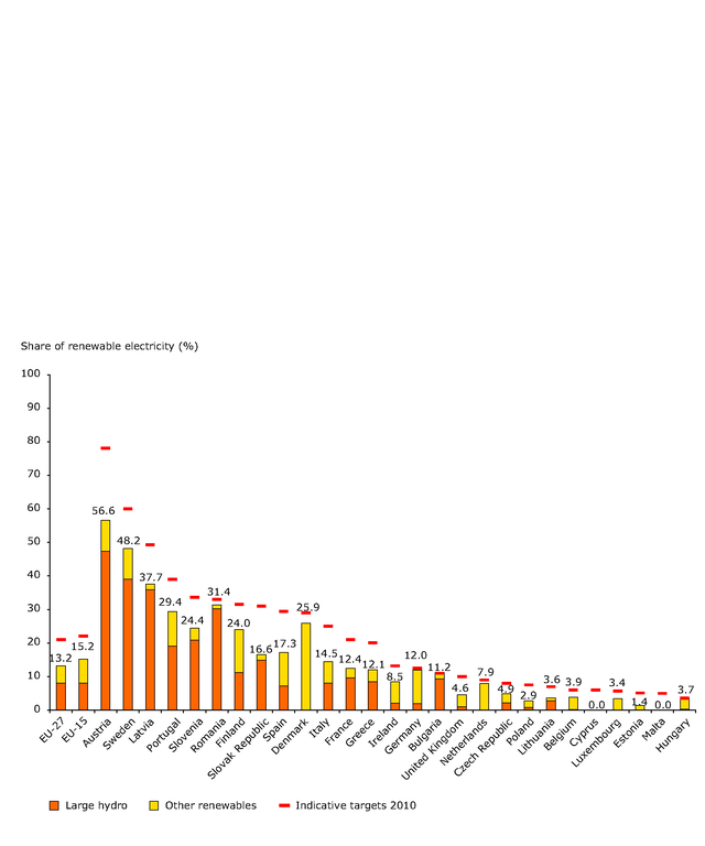 Share of renewable electricity in gross electricity consumption in EU-27 in 2006 (and 2010 indicative targets)