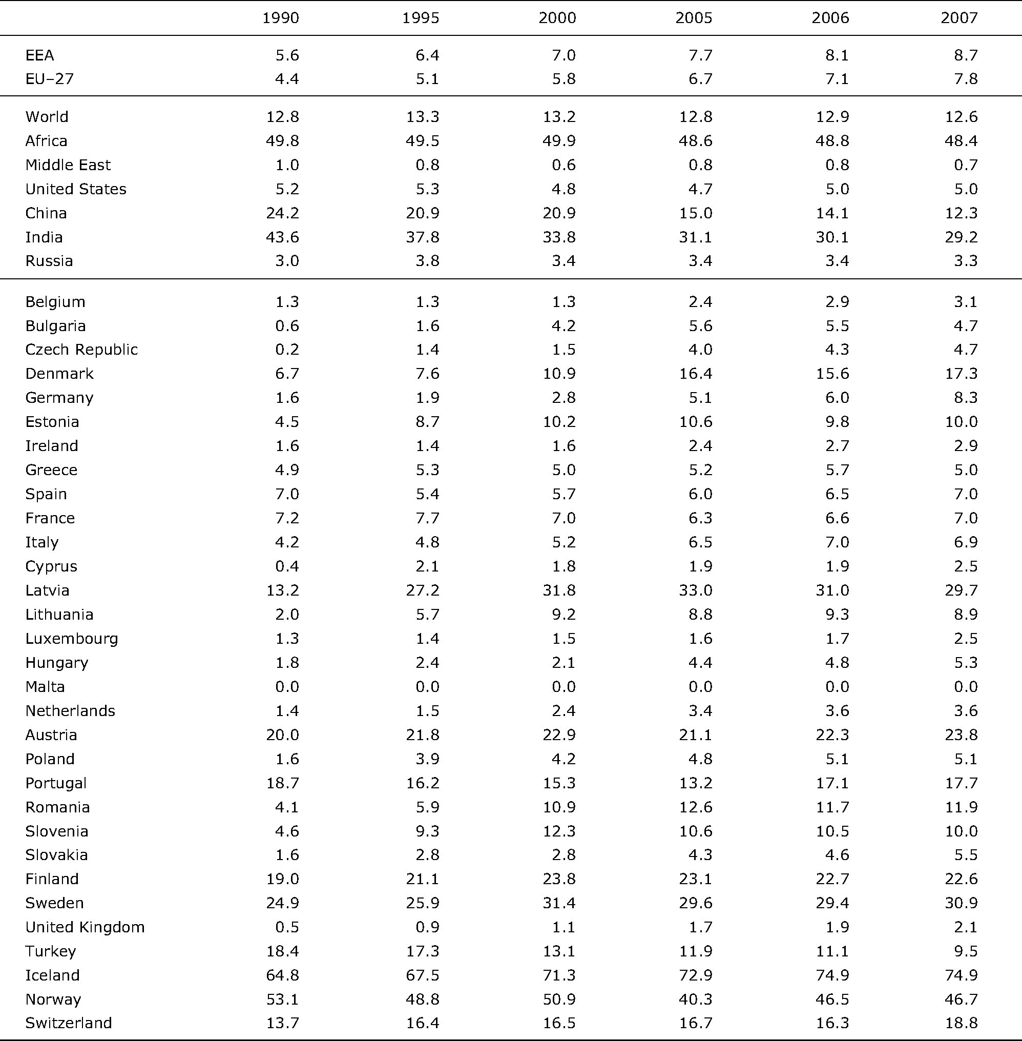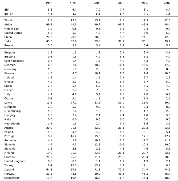 No data for Liechtenstein is available from Eurostat. No data available for Iceland for 2007. Data for World, Middle East, Africa, United States, China, India and Russia are extracted from IEA database.